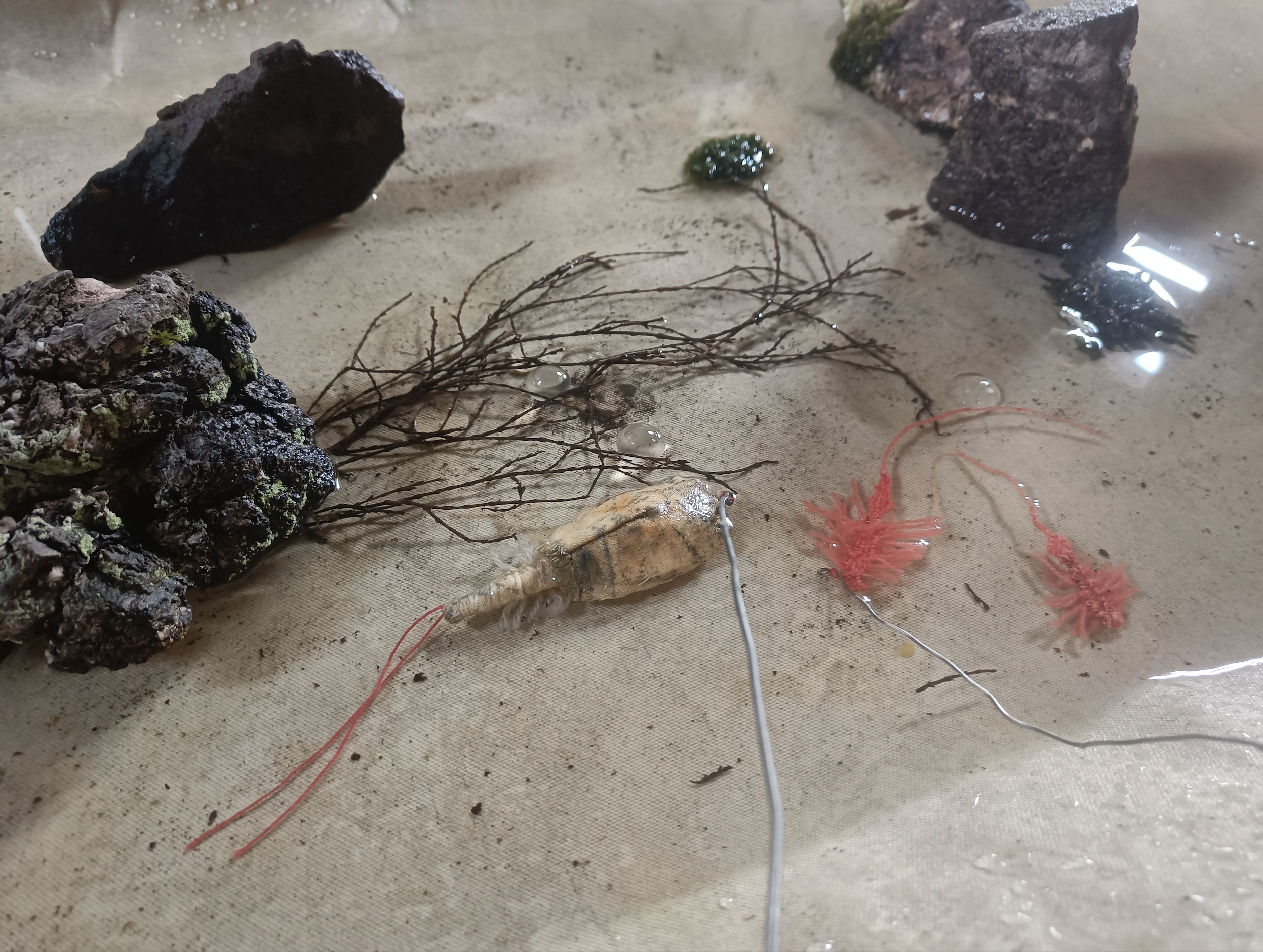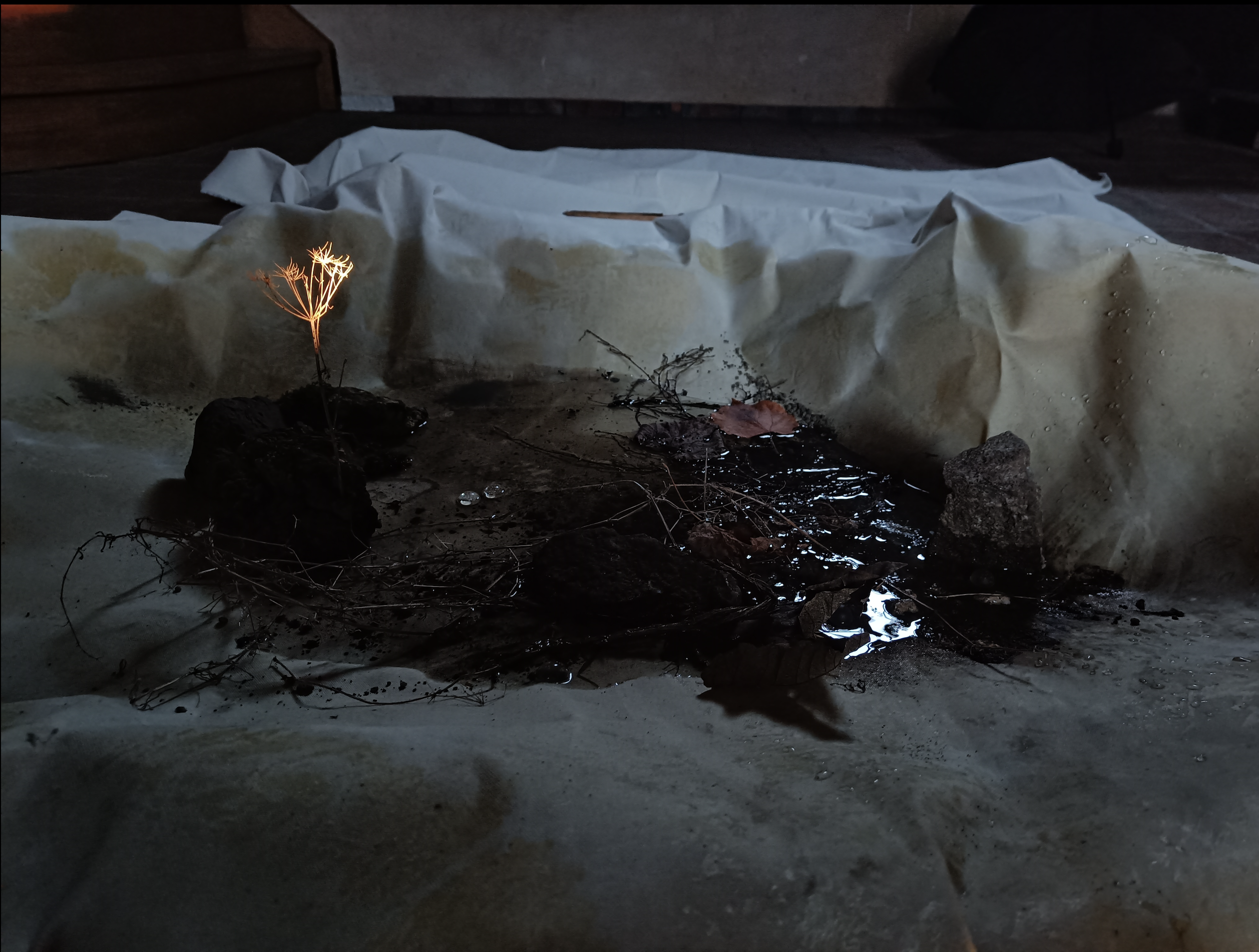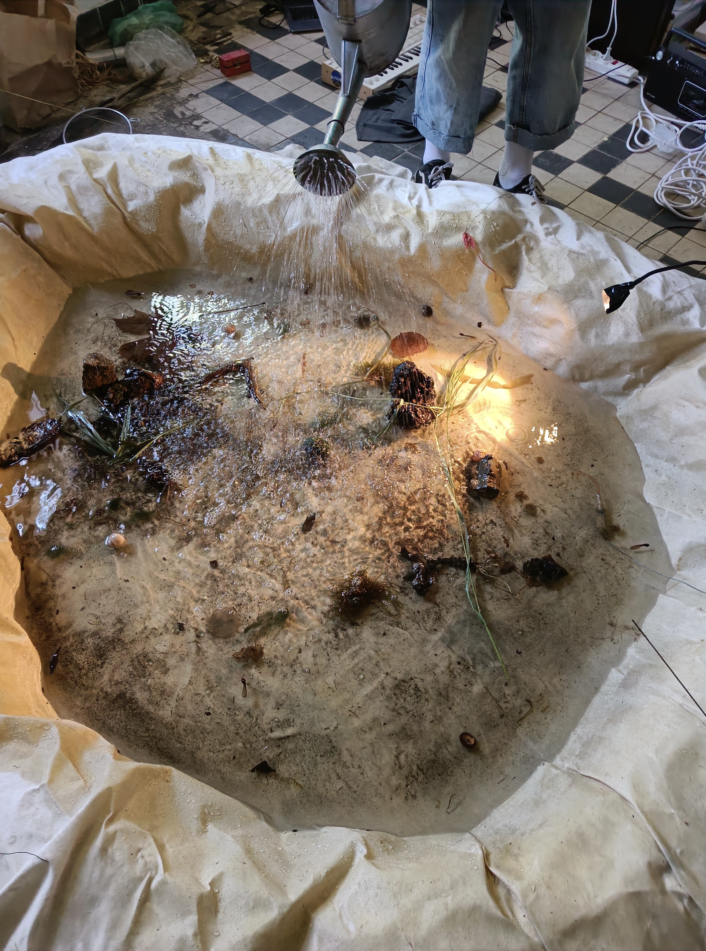 Diváci jsou usazeni okolo bazénku, který se postupně napouští vodou a zaplňuje životem. Mohou se na zabydlování tůně sami podílet nebo jen sledovat jakými proměnami tůň prochází. S přibývající vodou se ze suchého, nehostinného místa stává rej prastarých tvorů a organismů – reálných i fantaskních, které by se bez onoho koloběhu sucha a vody neobešli.